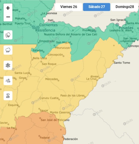 El mapa de riesgo se extiende a gran parte del territorio provincial. Además de la Capital, las localidades bajo vigilancia son: