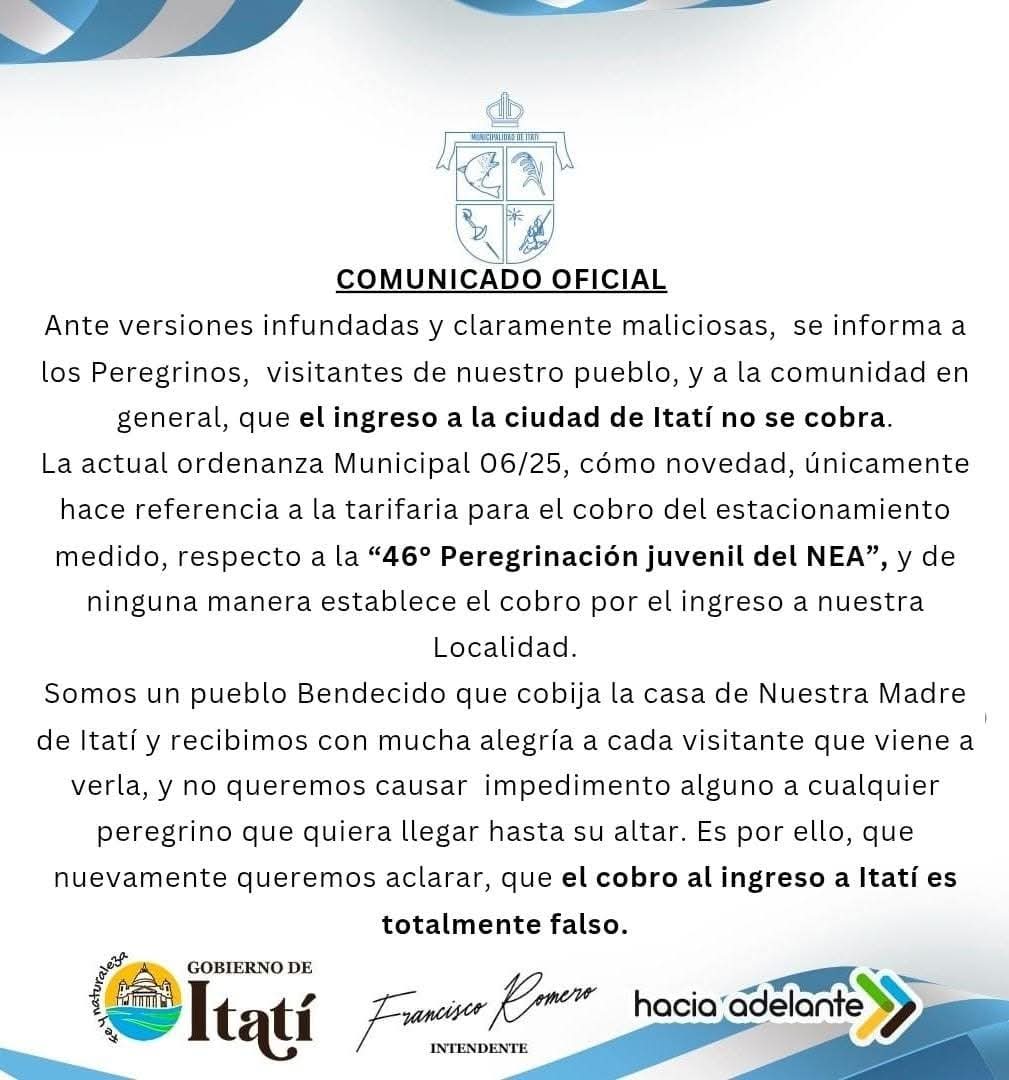 A lo que explicaron que “la actual ordenanza Municipal 06/25, cómo novedad, únicamente hace referencia a la tarifaria para el cobro del estacionamiento medido, respecto a la «46° Peregrinación juvenil del NEA», y de ninguna manera establece el cobro por el ingreso a nuestra localidad”.