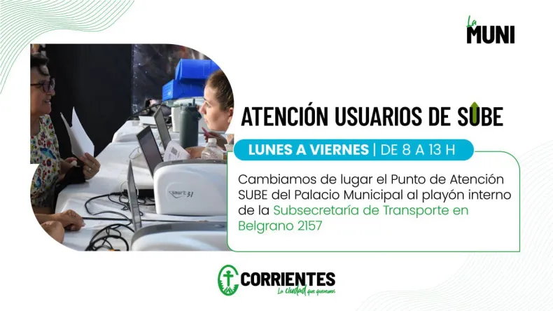 La Municipalidad de Corrientes Capital informó el traslado del Punto de Atención SUBE que funcionaba en el Palacio Municipal, con el objetivo de mejorar el servicio y la atención de los usuarios del sistema de transporte público.