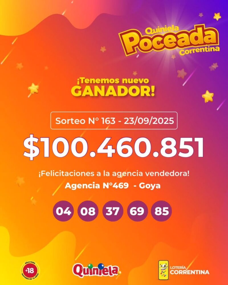 “Un goyano es el nuevo ganador de la Quiniela Poceada Correntina. Este martes un afortunado apostador se lleva 100.460.851 millones de pesos”, compartió en sus redes sociales Lotería Correntina.