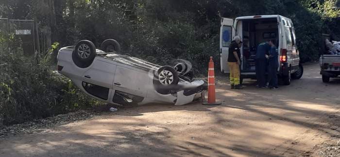 El siniestro afortunadamente fue solo un susto para el conductor que pudo salir de la cabina del Volkswagen Voyage por sus propios medios, en tanto que tuvo que lamentar daños materiales ya que el vehículo quedó con sus cuatro ruedas hacia el cielo.