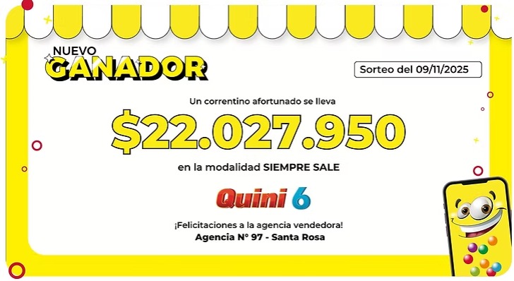 En el último sorteo de la modalidad «Siempre Sale» del Quini 6, un apostador de la localidad de Santa Rosa obtuvo un premio de $22.027.950, tras acertar cinco números de la jugada.