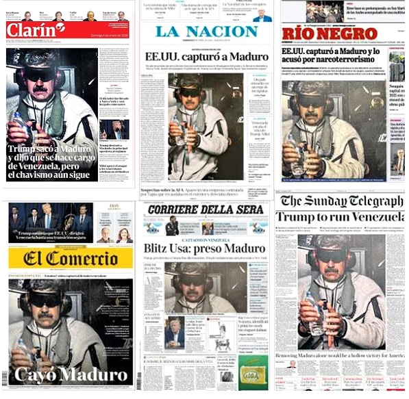 La incursión de Estados Unidos sobre Miraflores ocupó los títulos de los principales diarios con matices editoriales. En conjunto, la respuesta mediática mostró una rápida homogeneización de la agenda informativa global, con un marcado protagonismo de la imagen de la detención y de las declaraciones oficiales de Estados Unidos. La simultaneidad de los titulares y enfoques puso de relieve el peso de los actores internacionales y la capacidad del acontecimiento de alta intensidad política para ordenar la narrativa geopolítica a escala planetaria.