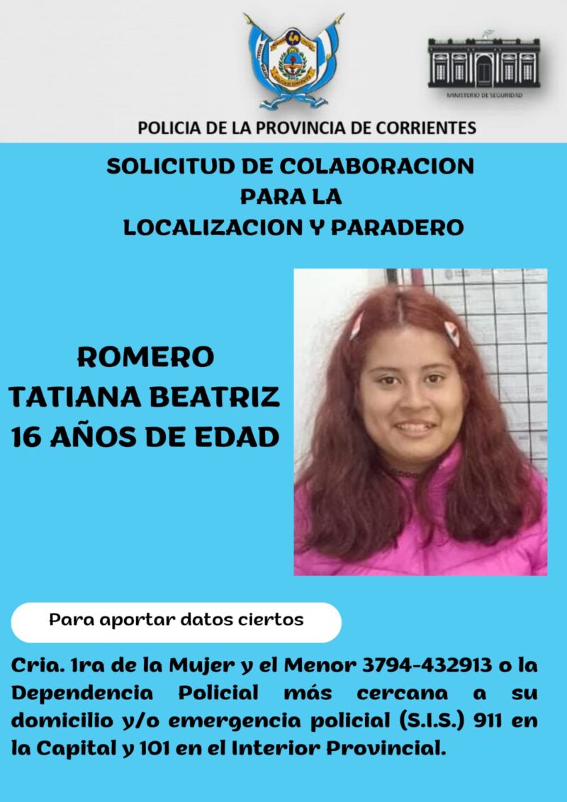 Se trata de Tatiana Beatriz Romero, una adolescente de 16 años de edad, quien se encuentra desaparecida desde este lunes 11 de agosto de 2025.