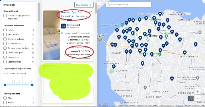 Por ejemplo, hospedarse en un departamento en la capital cordobesa, en la zona de Nueva Córdoba, en la misma fecha, de 1 dormitorio a 1,7 km del centro se puede conseguir a 26.624 o 33.441 pesos.