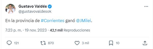En Corrientes, el gobernador Gustavo Valdés, quien en los últimos días había dejado deslizar que iba a votar por “un cambio”, anunció a través de su cuenta personal de X que en la provincia se impuso el candidato de La Libertad Avanza.