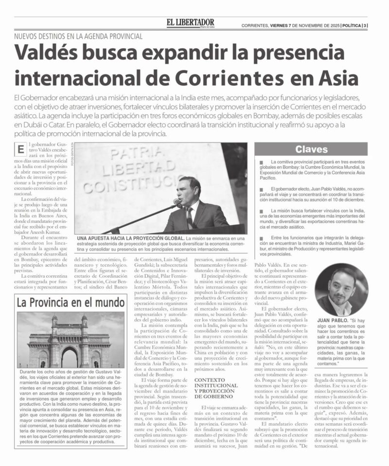 El viaje se enmarca además en un contexto de transición institucional en la provincia. Gustavo Valdés finalizará su segundo mandato el próximo 10 de diciembre, fecha en la que asumirá su sucesor, Juan Pablo Valdés. En ese sentido, el gobernador saliente continuará representando a Corrientes en el exterior, mientras el equipo entrante avanza en el armado del nuevo gabinete provincial.