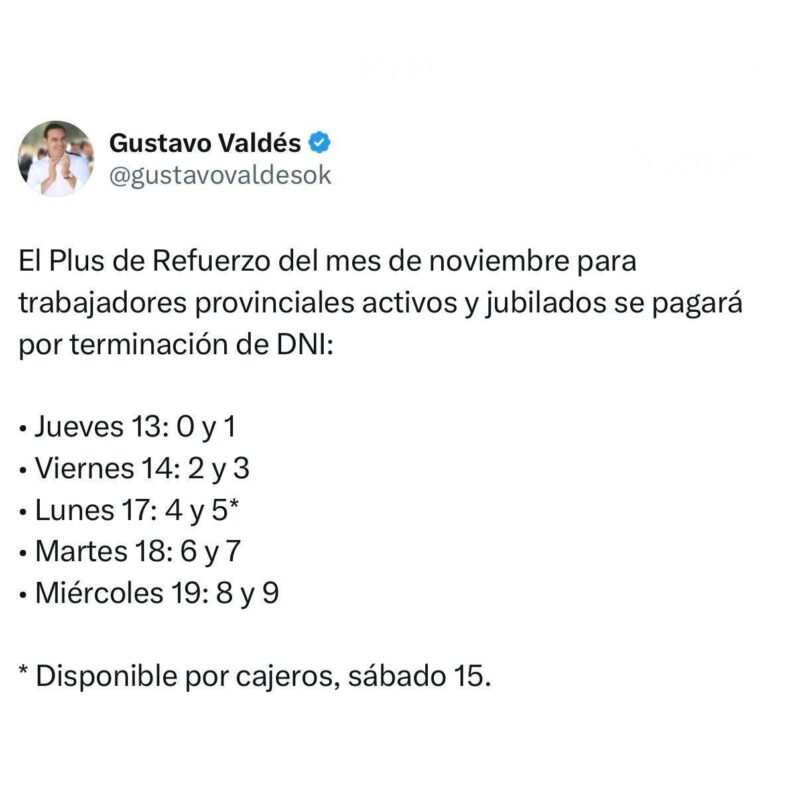 El primer Mandatario provincial Gustavo Valdés confirmó el pago del Plus de Refuerzo de $100 mil correspondiente a noviembre; el beneficio, que conforma el Ingreso Salarial Mensual, alcanza a los agentes de la administración pública provincial, activos, jubilados y pensionados. Comienza este jueves 13 y se extiende hasta el miércoles 19, inclusive.