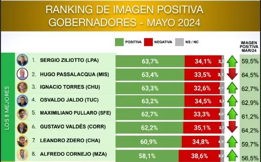 En lo que refiere a los gobernadores, el mandatario de mejor imagen es Sergio Ziliotto, de La Pampa. Gustavo Valdés se posicionó sexto, con 62,2 por ciento de imagen positiva, marcando un descenso de su anterior medición en marzo, que estaba en el 64,2 por ciento.