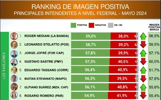 Por otra parte, Eduardo Tassano se posicionó en la quinta posición, con el 56,4 por ciento de imagen positiva, con un aumento del cinco por ciento respecto de marzo.