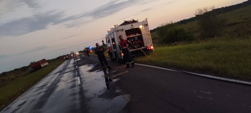 En la madrugada de hoy, se produjo un violento choque de camiones en la Ruta Nacional 12. El siniestro ocurrió a la altura del kilómetro 925, en el departamento de Saladas.