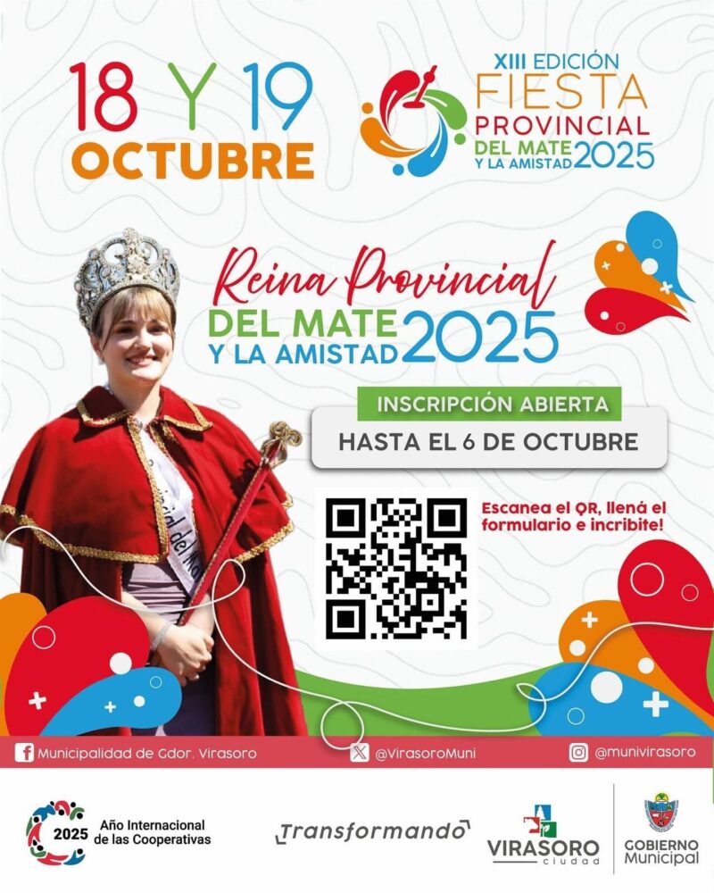 También coronará a la próxima Reina Provincial del Mate y la Amistad, la sucesora de Ana Paula Roleri. Las jóvenes que deseen postularse al cetro tienen la oportunidad de inscribirse escaneando el código QR del formulario (ver flyer), el cual estará habilitado hasta el próximo lunes 6 de octubre.