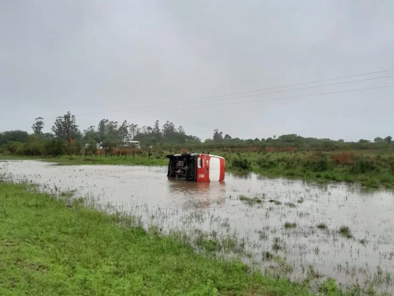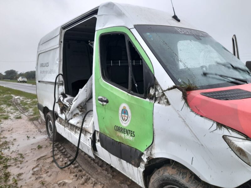 Ocurrió en Ruta Provincial N° 5 en su intersección con calle 13 de Julio, cuando el chofer de la ambulancia esquivó una motocicleta que se cruzó en su camino. Como consecuencia de la brusca maniobra y el agua presente en la calzada producto de la lluvia, perdió el control y terminó volcando a barios metros de la banquina.