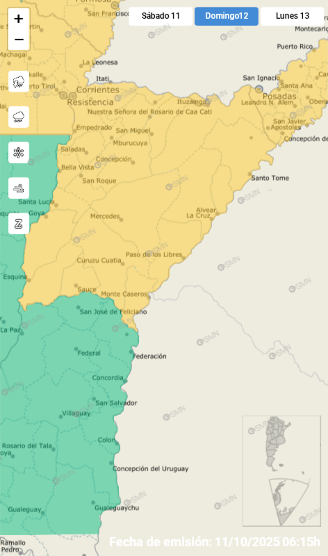 “El área será afectada por tormentas aisladas de variada intensidad, algunas localmente fuertes. Se espera que las mismas estén acompañadas de abundante caída de agua en cortos períodos, frecuente actividad eléctrica, granizo ocasional y ráfagas que podrían superar los 60 km/h”, indica el reporte del SMN.