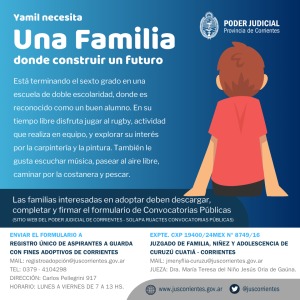 La doctora María Teresa del Niño Jesús Oria de Gaúna (subrogante) lanzó esta reciente convocatoria pública. Desde el Juzgado de Familia, Niñez y Adolescencia de la ciudad de Curuzú Cuatiá invitan a la comunidad a sumarse a esta iniciativa, que representa una oportunidad para cambiar la vida de Yamil y la de una familia que desee brindarle amor, acompañamiento y contención.